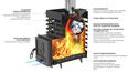 • Глубокая невентилируемая каменка-труба из стали 09Г2С толщиной 4 мм прогревается открытым пламенем для максимального нагрева камней, заложенных в нее и выполняет роль пламегасителя.